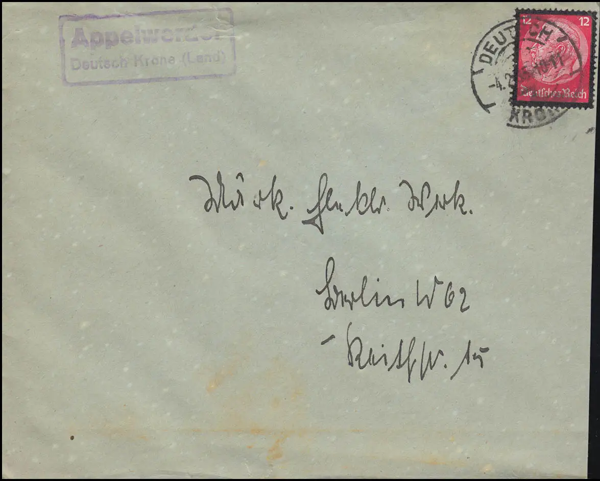 Landpost Appelwerder DEUTSCH KRONE (LAND) 4.2.35 auf Brief nach Berlin