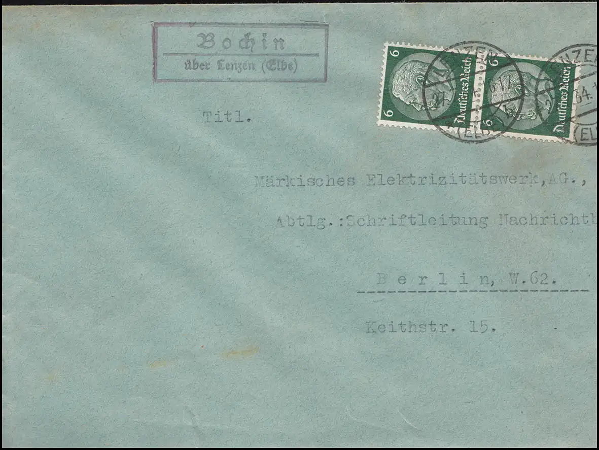 Landpost Bochin über Lenzen Elbe, Brief LENZEN 1934
