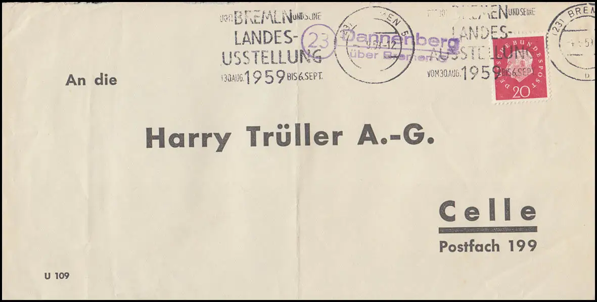 Landpost Dannenberg über Bremen 4.9.59 Bedarfserhaltung/senkrechter Briefbug