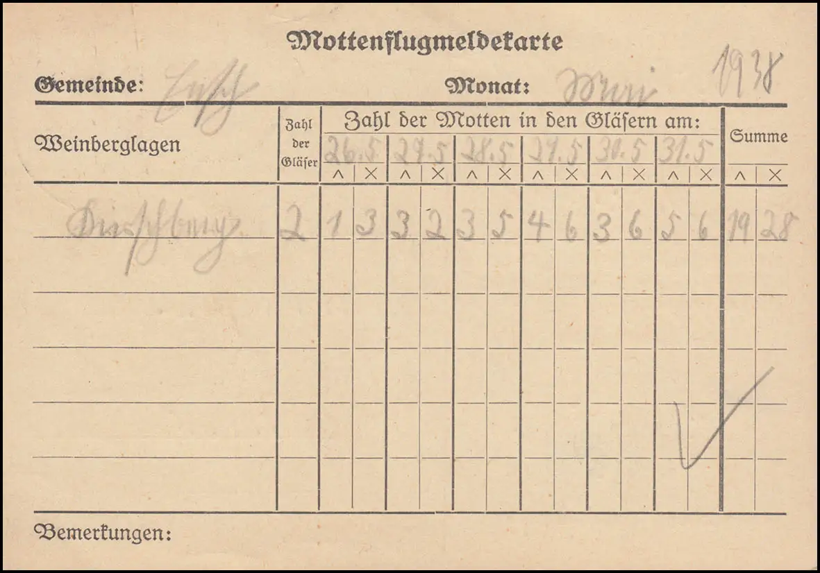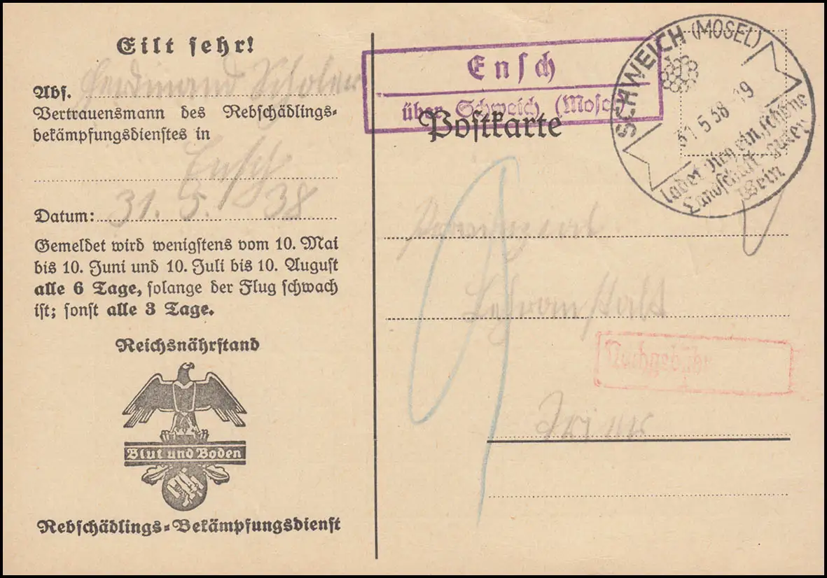 Landpost Ensch über Schweich Mosel auf Dienst Mottenflugmeldekarte, 31.5.38