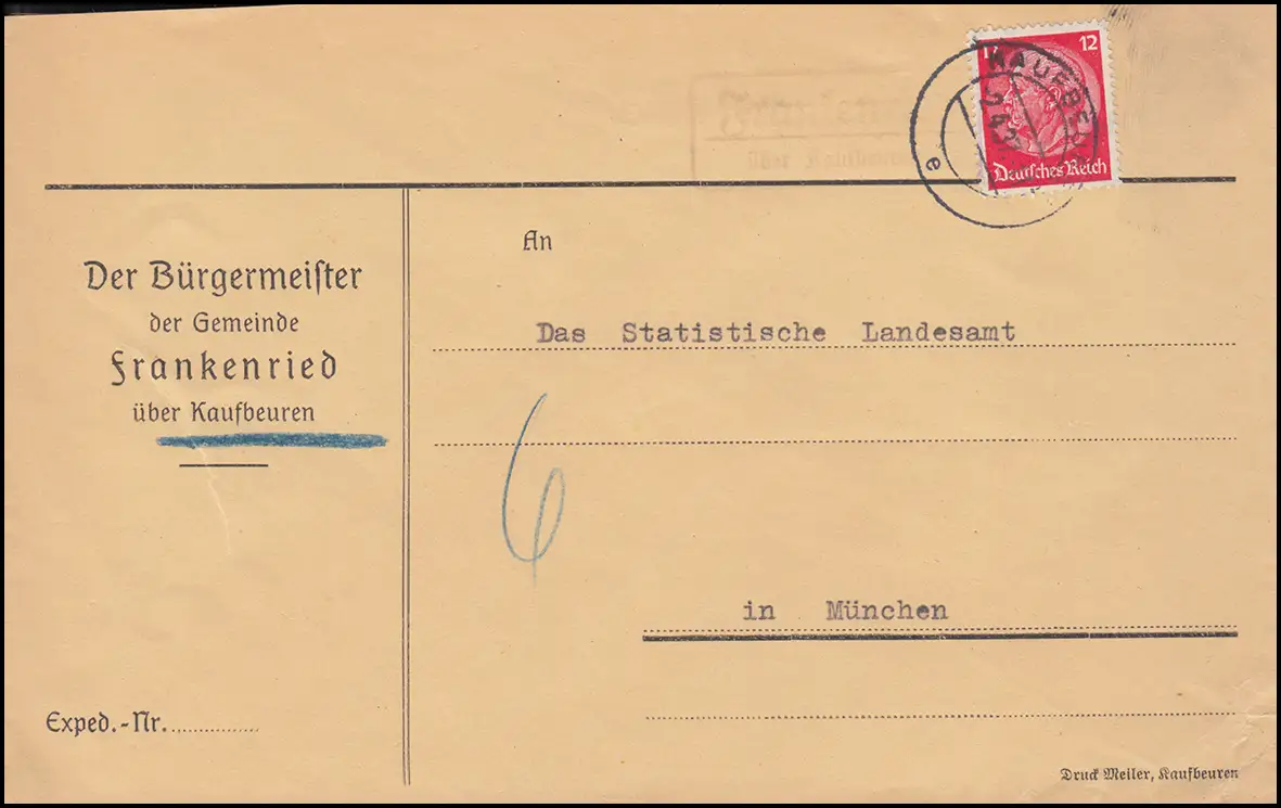 vom Bürgermeister der Gemeinde Frankrenried über Kaufbeuren an das Statsitische Landesamt in München