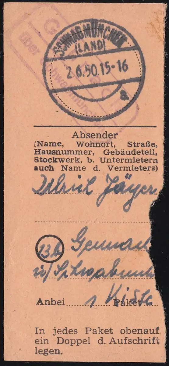 Landpost Gennach über SCHWABMÜNCHEN (LAND) 2.6.50 auf Paketkarten-Abschnitt