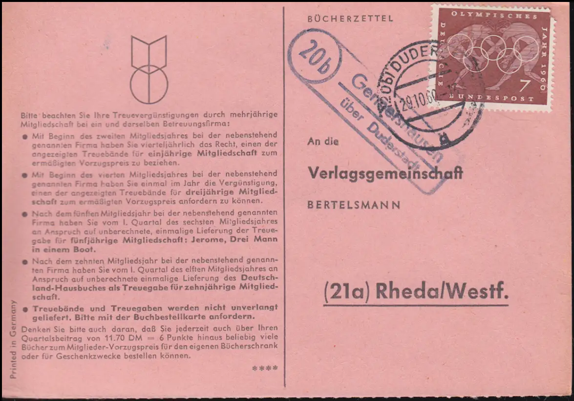 Landpost Germershausen über DUDERSTADT 29.10.1960 auf Bücherzettel nach Rheda