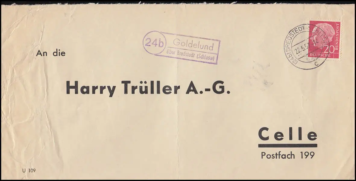 Landpost Goldelund über Bredstedt 22.5.57 Bedarfserhaltung/senkrechter Briefbug