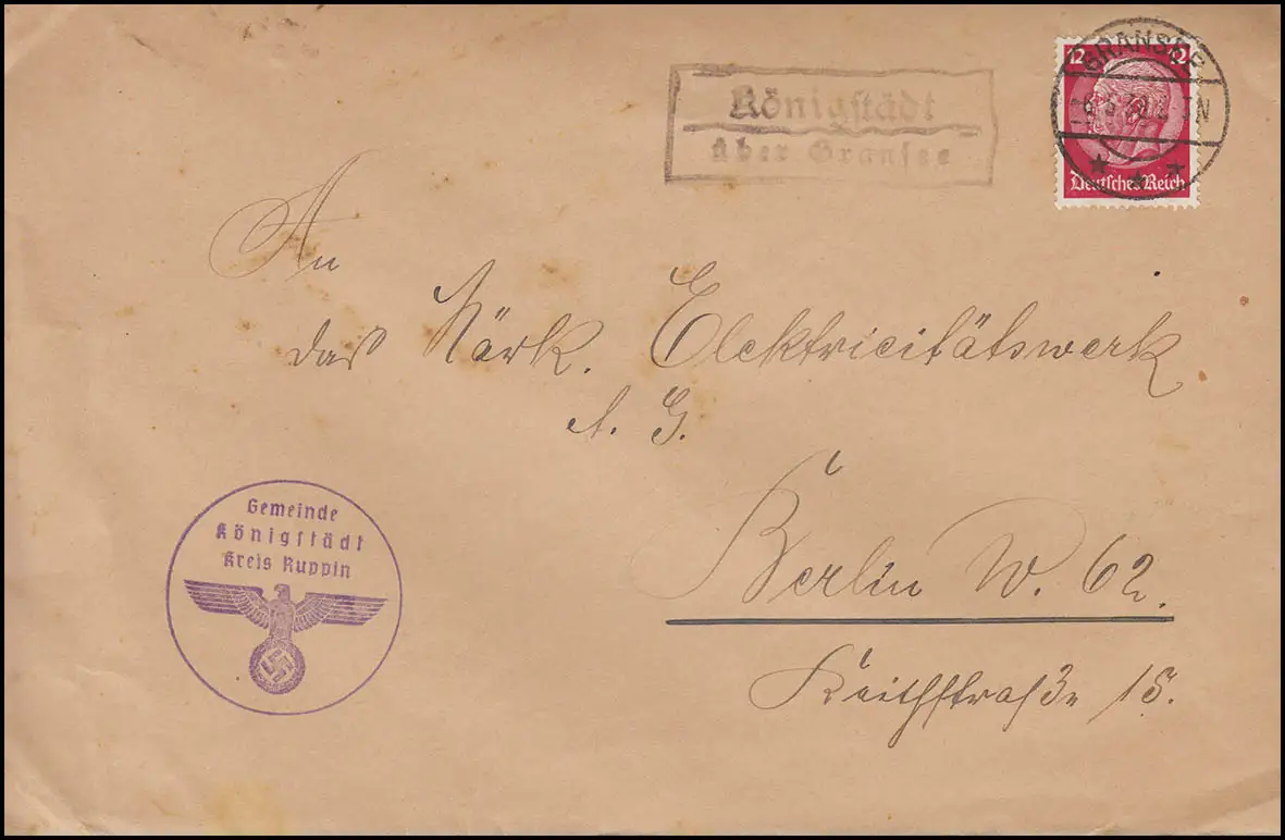 Landpost KÖNIGSTÄDT (Wolfsruh) Ruppin über BRANSEE 6.5.38 auf Brief nach BERLIN