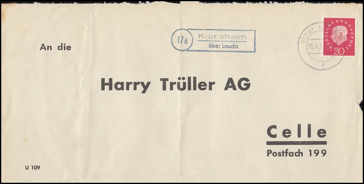 Landpost Krensheim über Lauda 1961 Bedarfserhaltung/senkrechter Briefbug