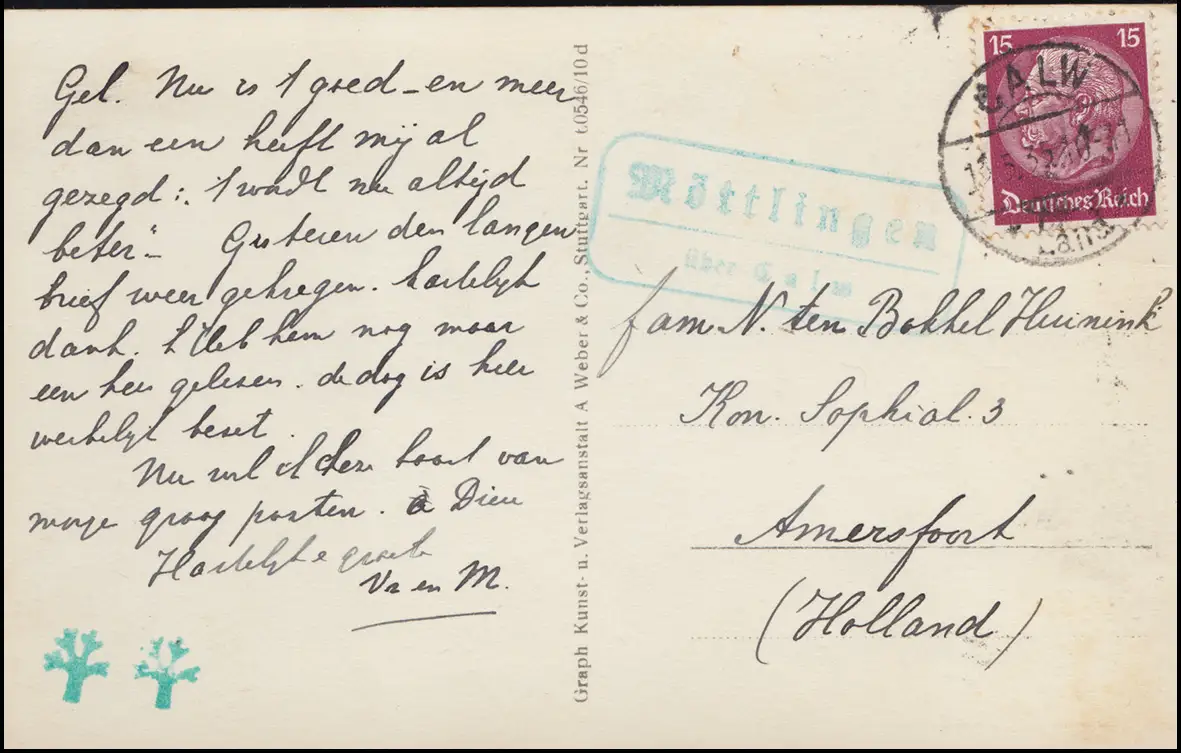 Landpost Möttlingen über CALW LAND 15.5.1935 auf AK Bad Liebenzell