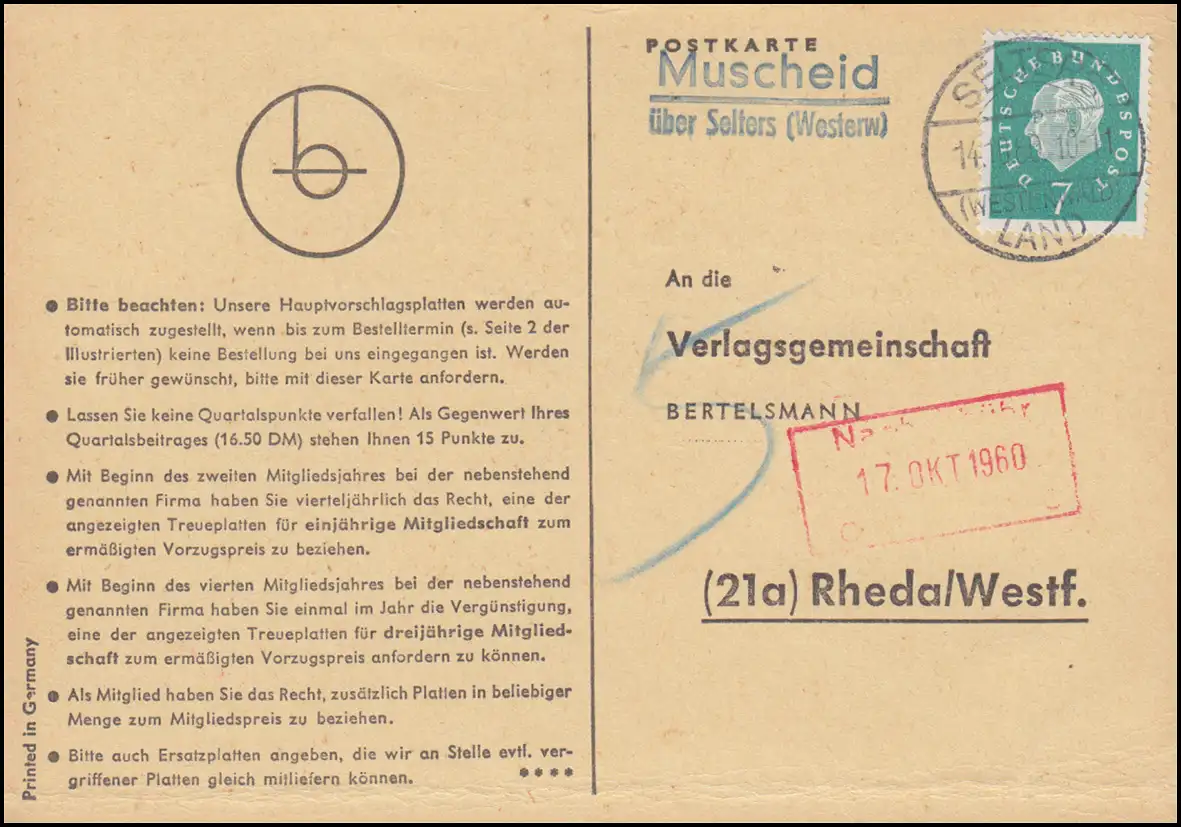 Landpost Muscheid über SELTERS WESTERWALD LAND 14.10.60 auf Postkarte nach Rheda