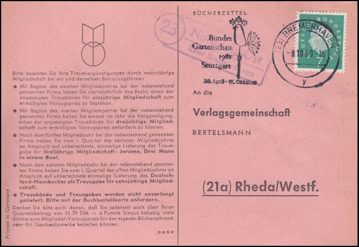 Landpost Nordholz-Ost über BREMERHAVEN 8.10.1960 auf Postkarte nach Rheda