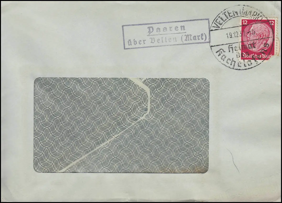 Landpost PAAREN über VELTEN (Mark) 18.12.37 SSt Heimat Kachelofen nach BERLIN