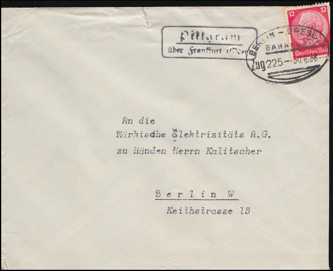 Landpost Pillgram über Frankfurt/Oder Bahnpost BERLIN-BRESLAU ZUG 225 - 30.8.38