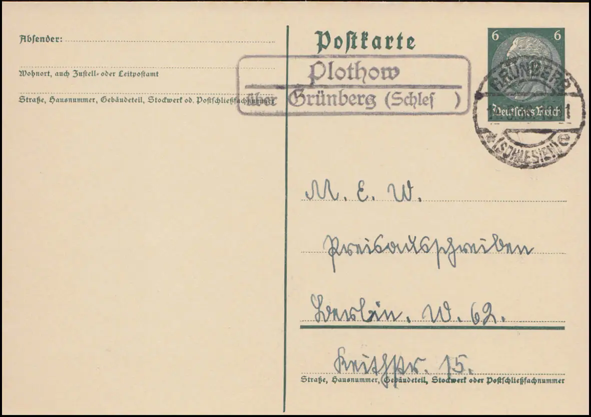 Landpost Plothow über Grünberg (Schlesien) 14.5.36 auf Postkarte