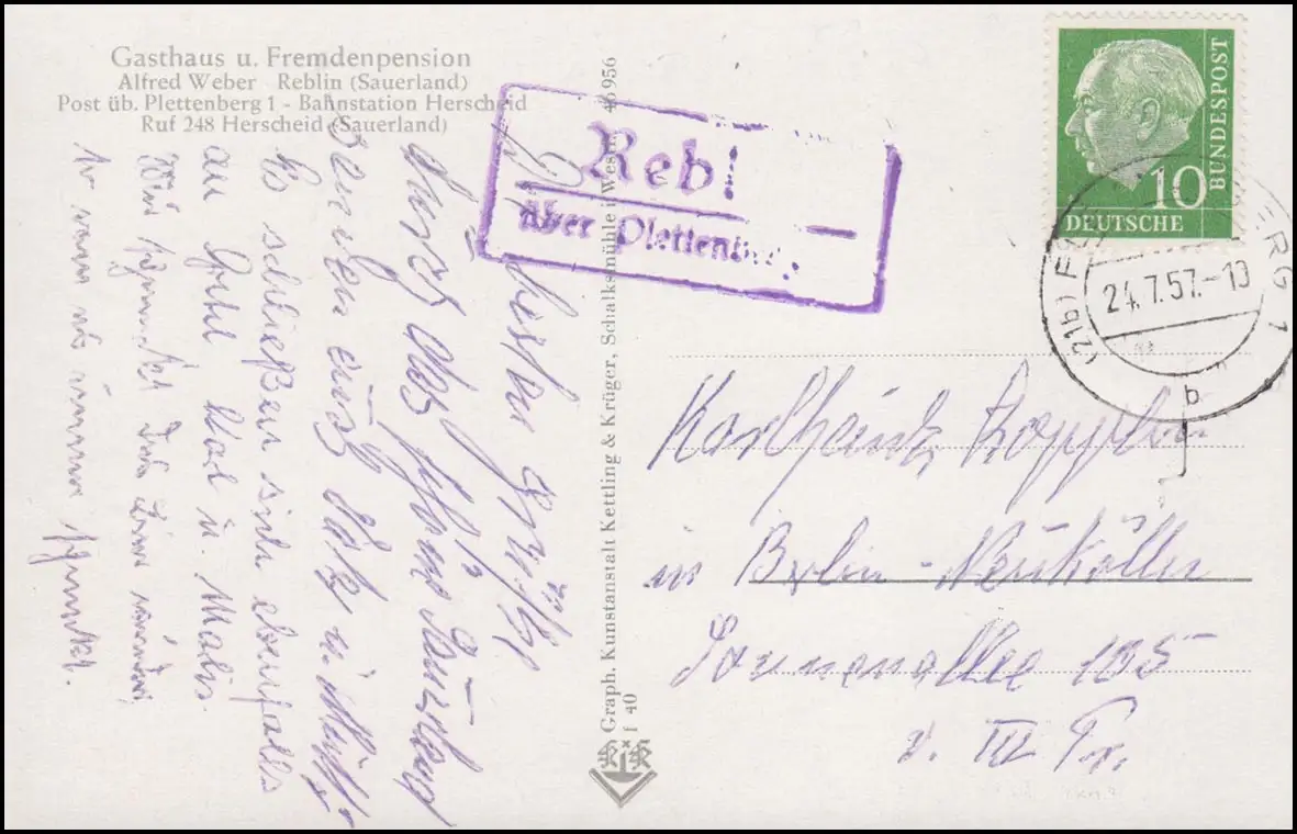 Landpost Reblin über PLETTENBERG 24.7.1957 auf AK Versetalsperre / Sauerland