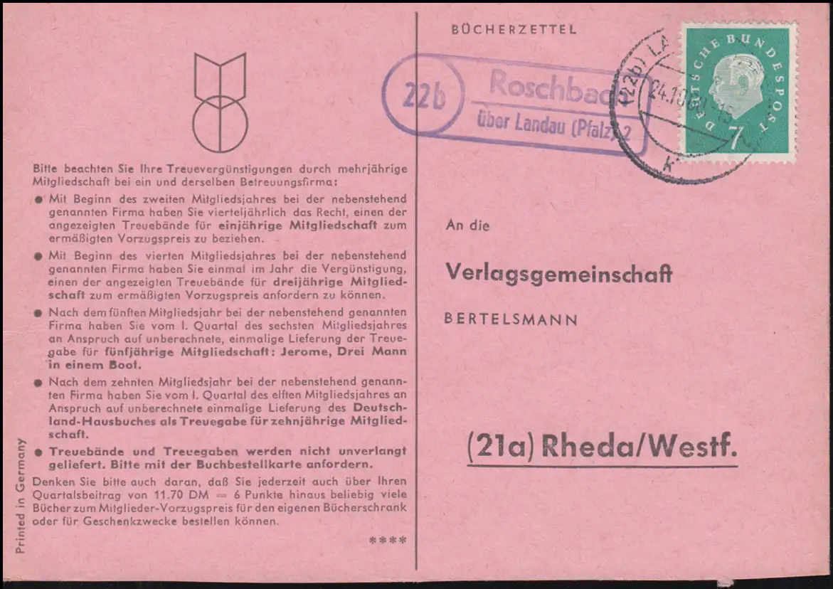 Landpost Roschbach über LANDAU (PFALZ) 2 - 24.10.1960 auf Postkarte nach Rheda