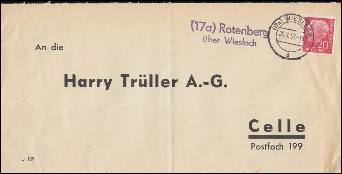 Landpost Rotenberg über Wiesloch 20.9.57 Bedarfserhaltung/senkrechter Briefbug