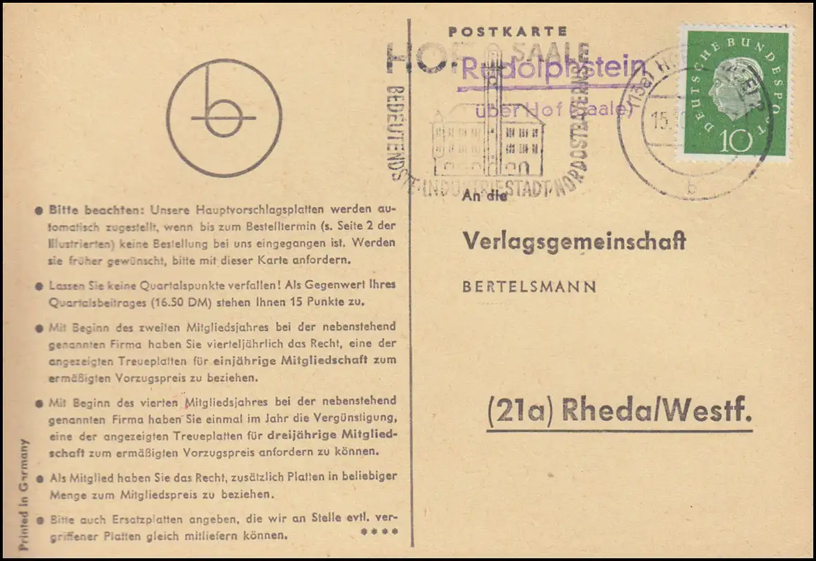 Landpost Rudolphstein über HOF (SAALE) 15.10.1960 auf Postkarte nach Rheda