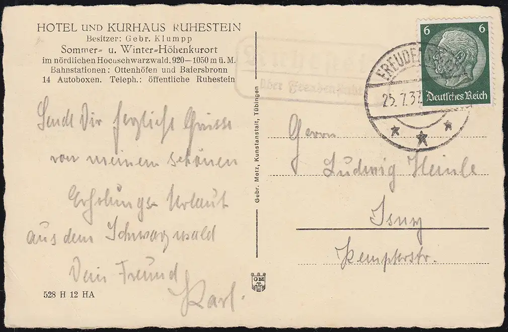 Landpost Ruhestein über FREUDENSTADT 25.7.37 auf AK Der Wildsee bei Ruhestein