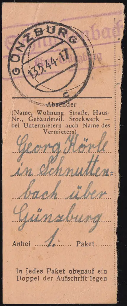 Landpost Schnuttenbach über GÜNZBURG 13.5.1944 auf Paketkartenabschnitt