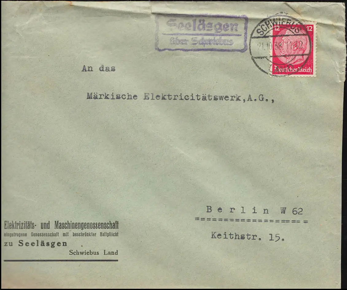 Landpost Seeläsgen über Schwiebus auf Brief SCHWIEBUS LAND 21.10.38