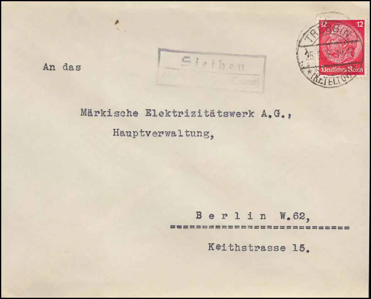 Landpost Siethen über Trebbin Kreis Teltow, Brief TREBBIN 1936