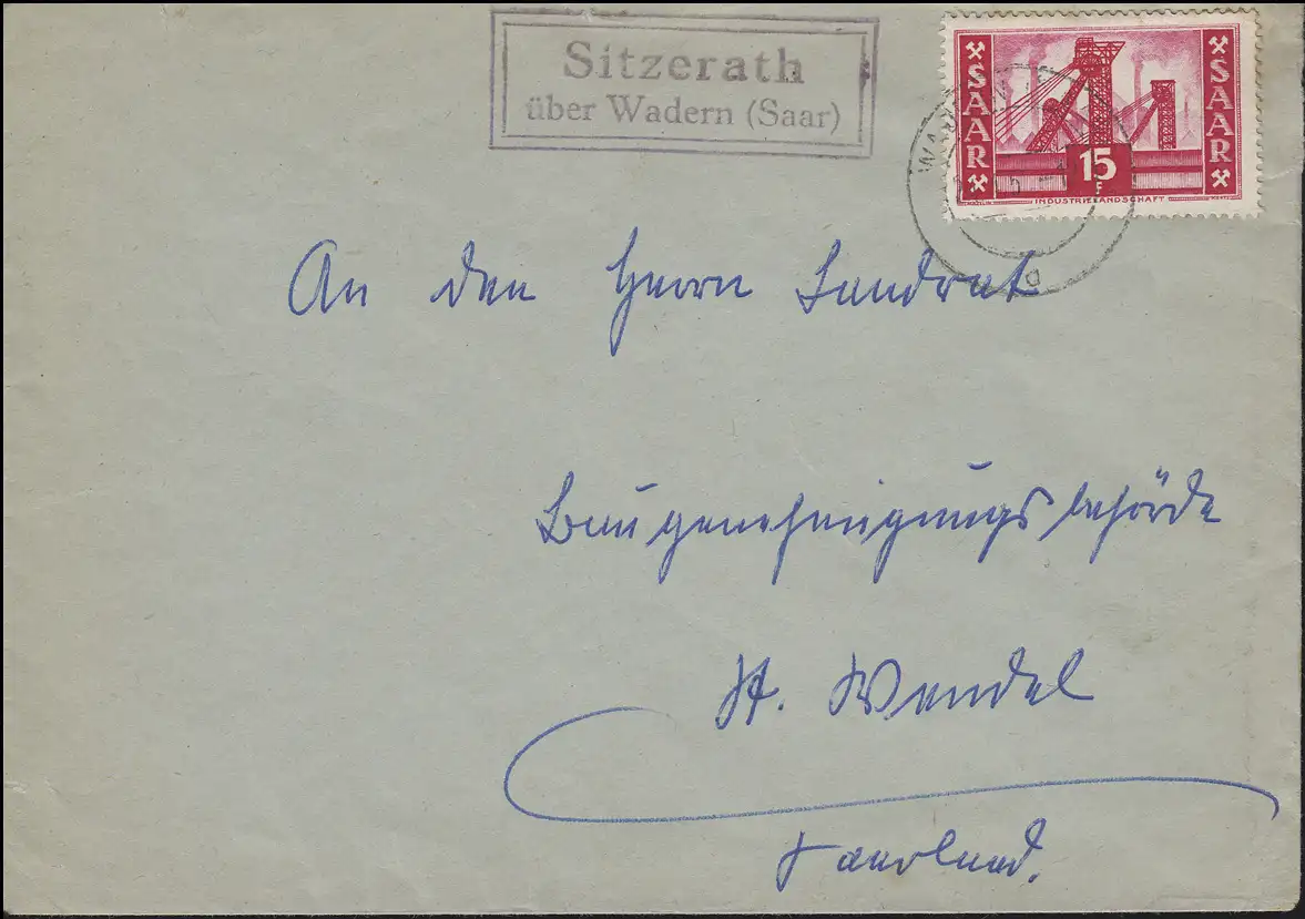 Landpost Sitzerath über WADERN (SAAR) 24.4.1956 auf Fernbrief mit 329 als EF