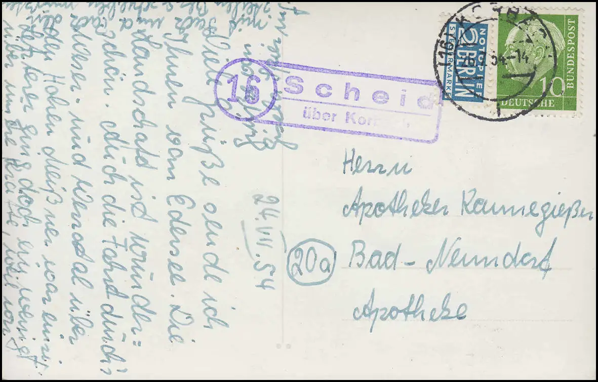 Landpost-Stempel (16) Scheid über KORBACH 26.7.54 auf AK Edersee - Sperrmauer