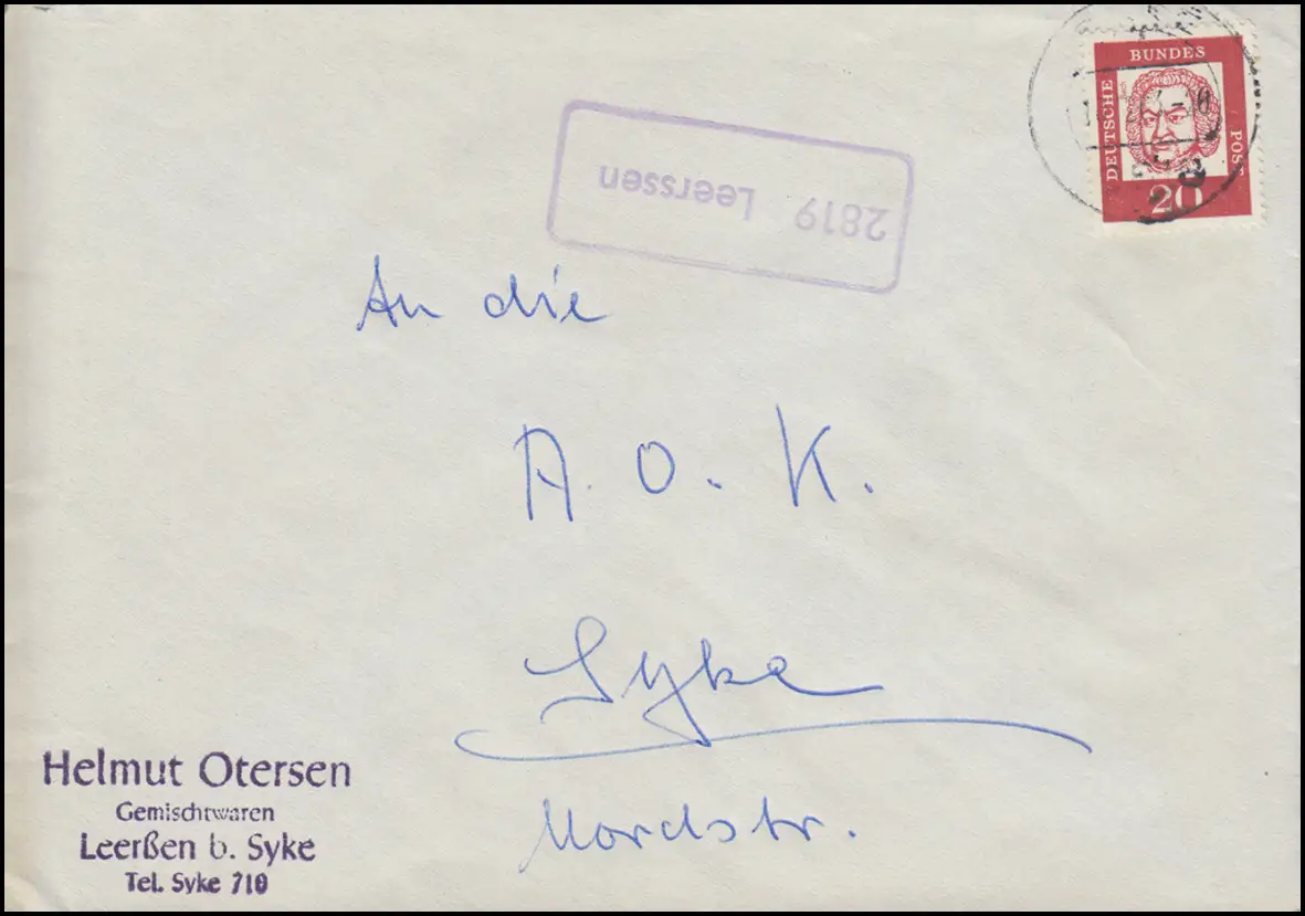Landpost-Stempel 2819 Leerssen auf Brief SYKE 1962 an die AOK in Syke
