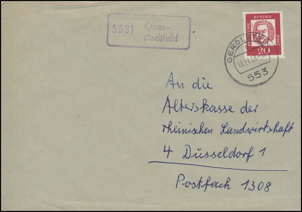 Landpost-Stempel 5531 Oberstadtfeld auf Brief GEROLSTEIN 16.11.1963