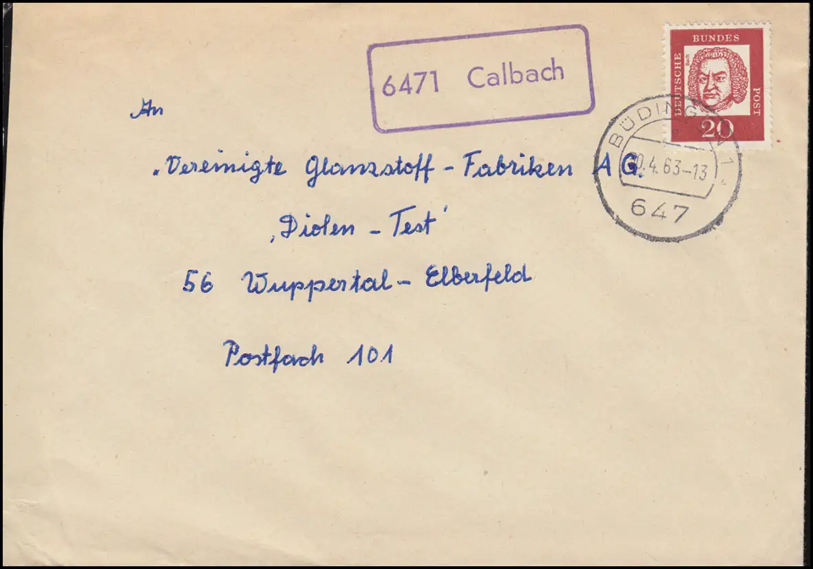 Landpost-Stempel 6471 Calbach auf Brief BÜDINGEN 30.4.1963