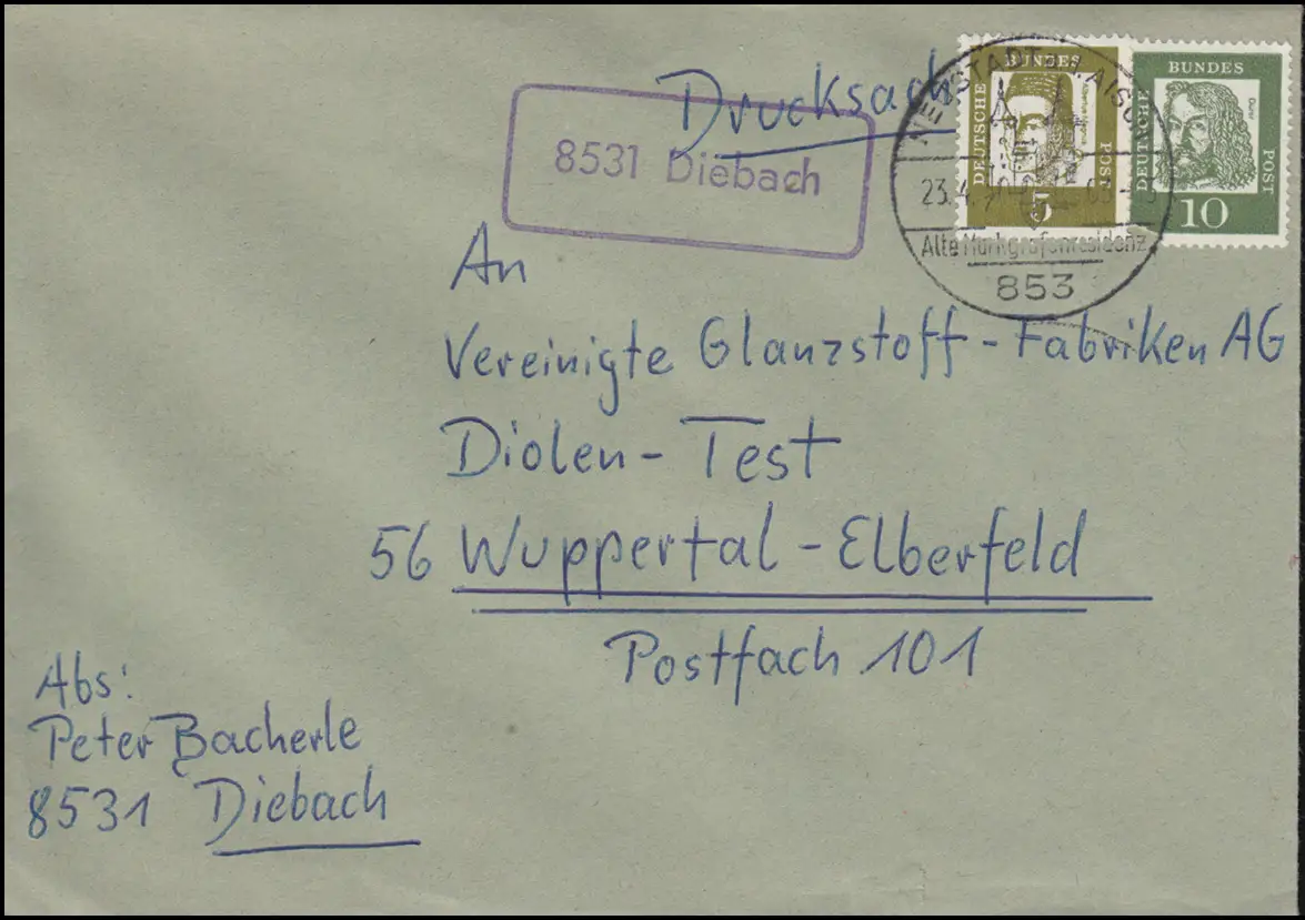 Landpost-Stempel 8531 Diebach auf Brief SSt NEUSTADT AN DER AISCH