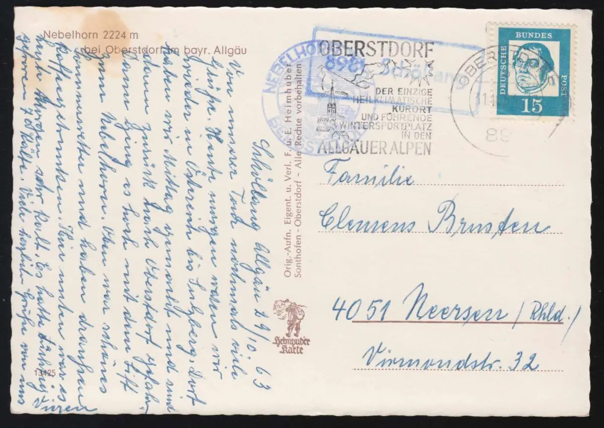 Landpost-Stempel 8981 Schöllang auf AK Nebelhorn, BERNSDORF 31.10.1963