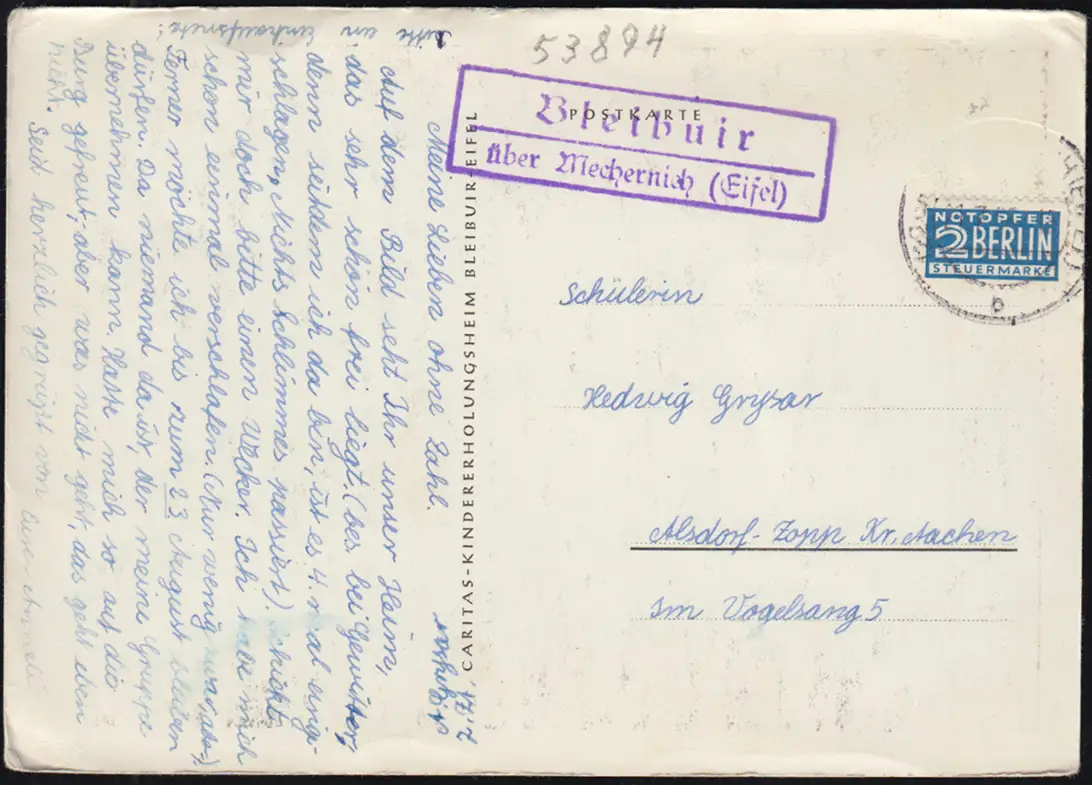 Ansichtskarte: Caritas-Kindererholungsheim Bleibuir / Eifel, Frankatur entfernt