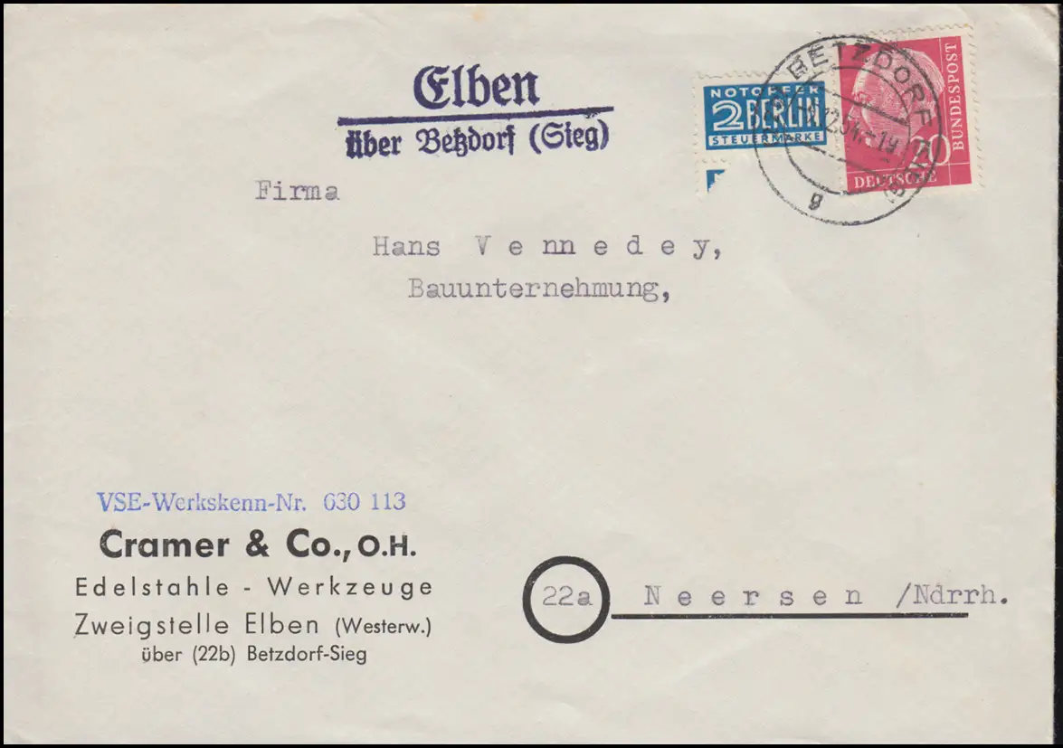 Landpost-Stempel Elben über BETZDORF (SIEG) 5.12.1954 auf Brief