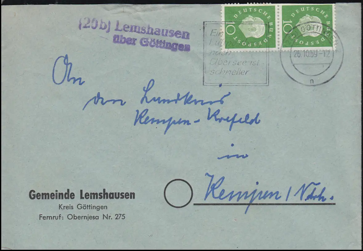Landpost-Stempel Lemshausen über GÖTTINGEN 26.10.1959 auf Brief