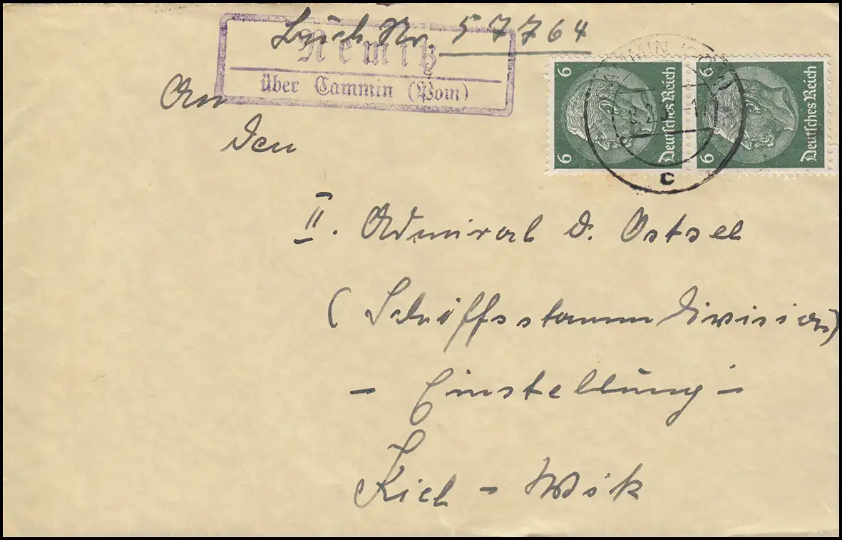 Landpost-Stempel Nemitz über CAMMIN (POMMERN) 8.2.1937 auf Brief