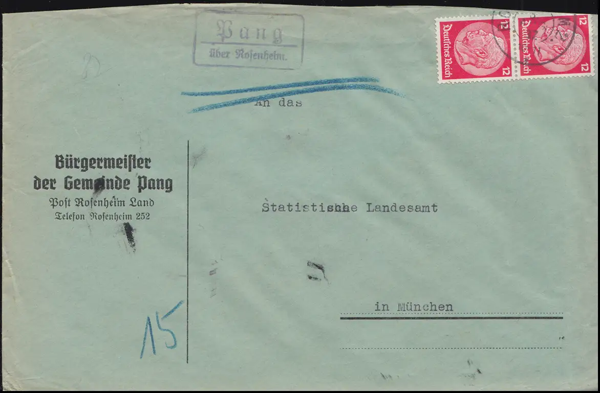 Landpost-Stempel Pang über ROSENHEIM 3.8.1937 auf Brief nach München