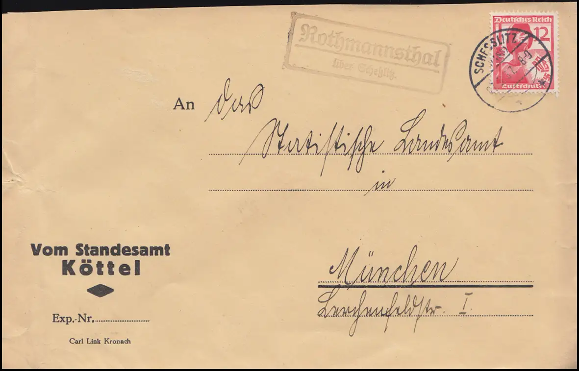 Landpost-Stempel Rothmannsthal über SCHESSLITZ (LAND) 27.3.37 Brief nach München