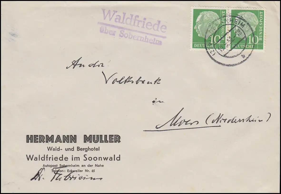 Landpost-Stempel Waldfriede über SOBERNHEIM 19.5.1958 auf Brief nach Moers
