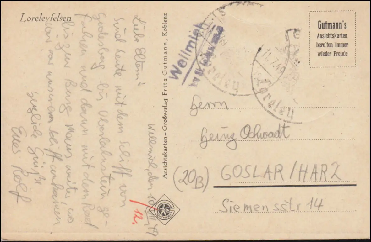 Landpost-Stempel Wellmich über St. Goarshausen auf AK Loreleyfeksen SSt 11.7.49