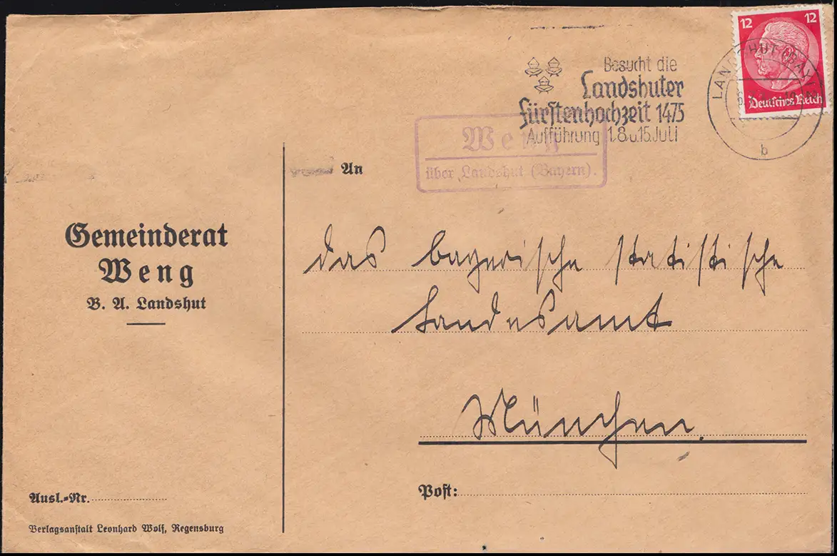 Landpost-Stempel Weng über Landshut Brief nach München Werbe-O LANDSHUT 6.7.34