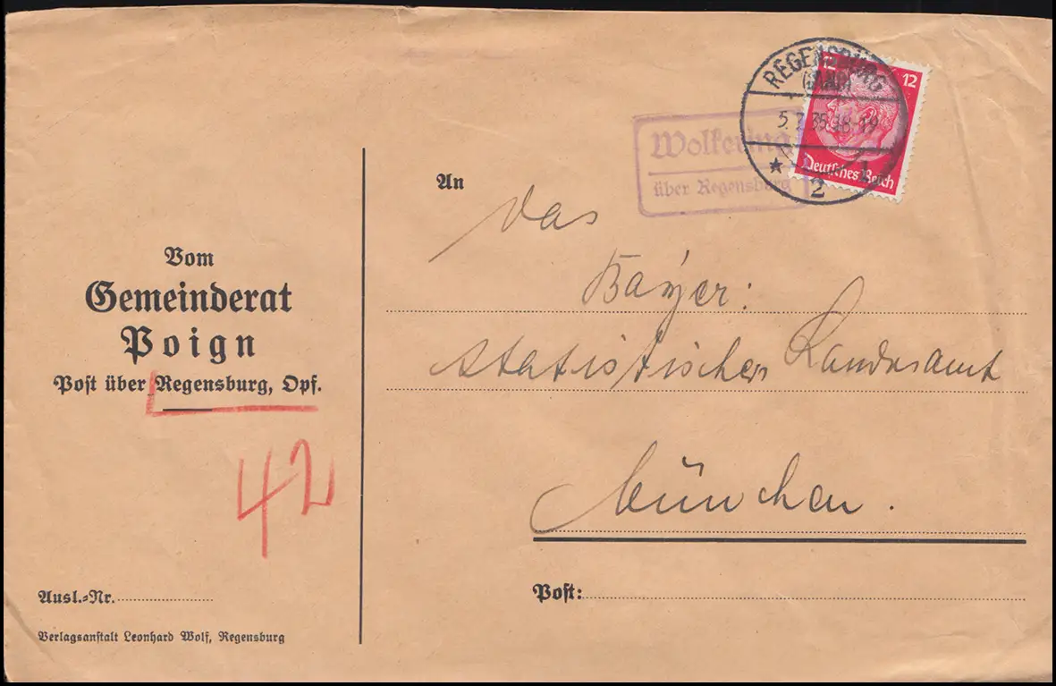 Landpost-Stempel Wolkering über REGENSBURG 2 (LAND) 5.3.1935 auf Brief