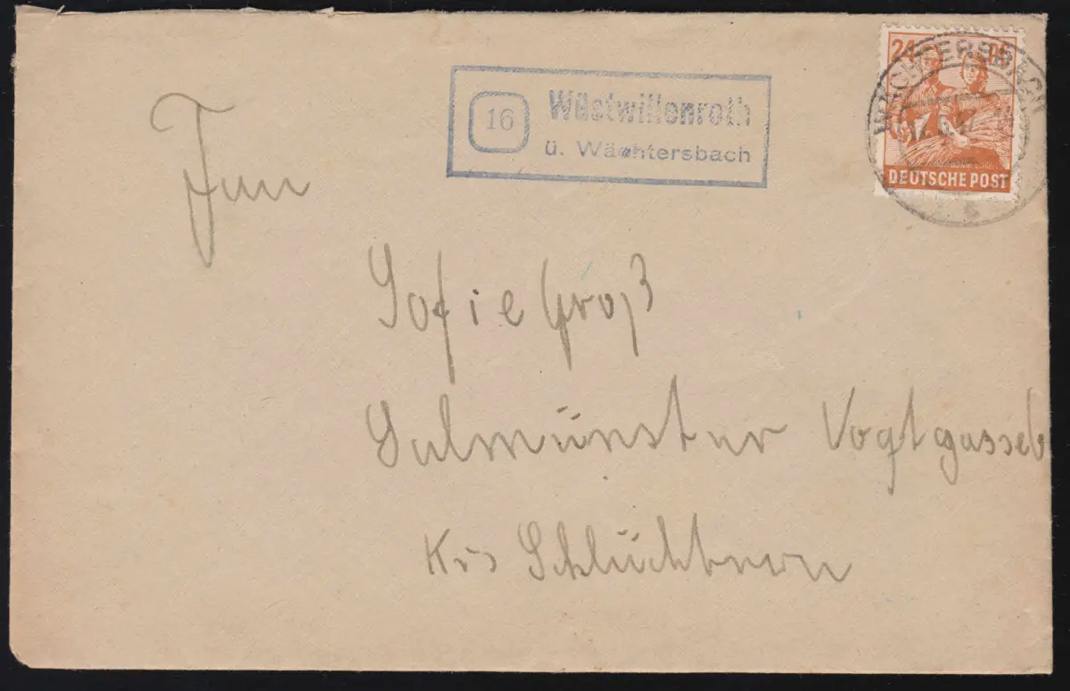 Landpost-Stempel Wüstwillenroth über WÄCHTERSBACH 12.6.1947 auf Fernbrief