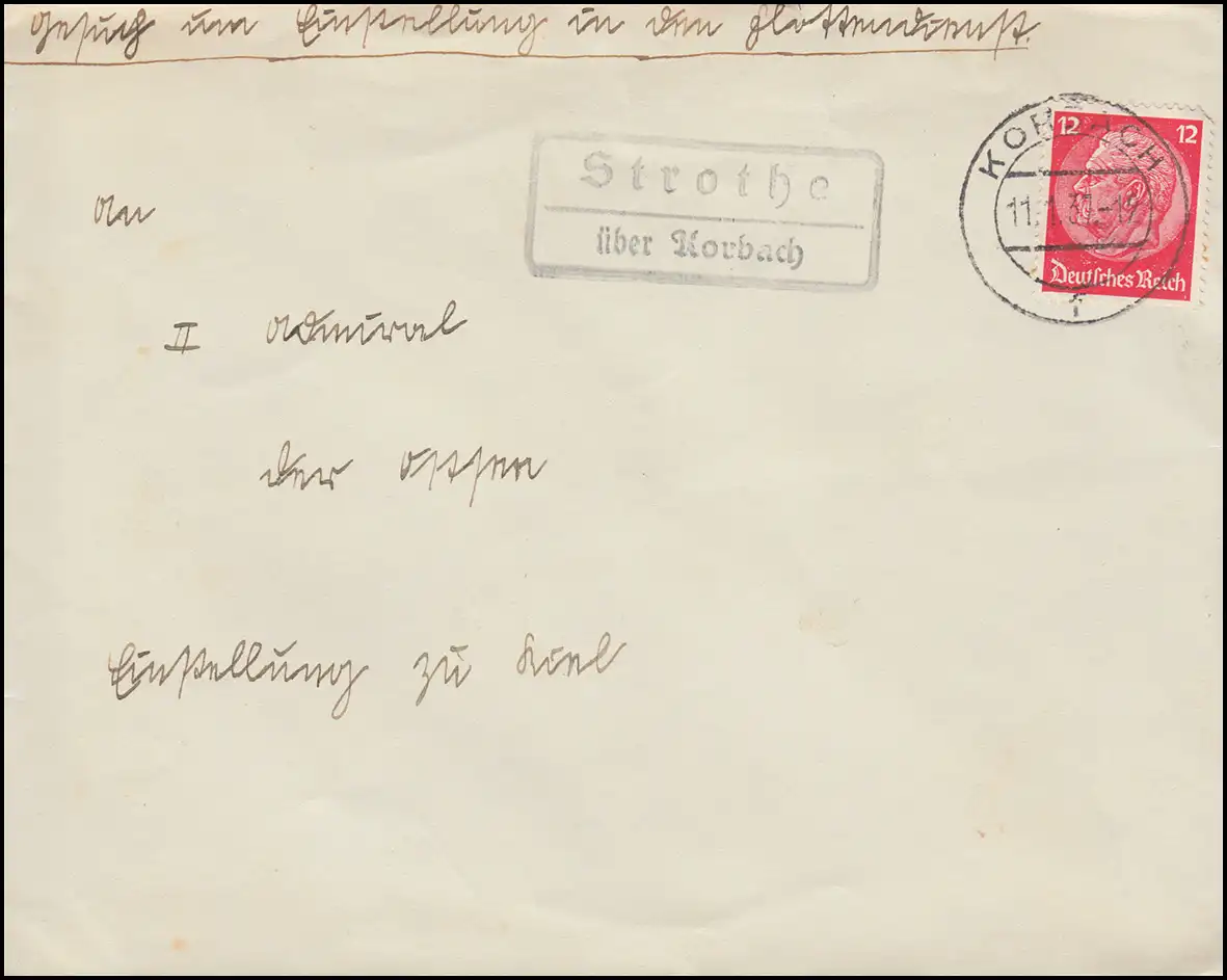 Landpost Strothe über KORBACH 11.1.1937 auf Fernbrief