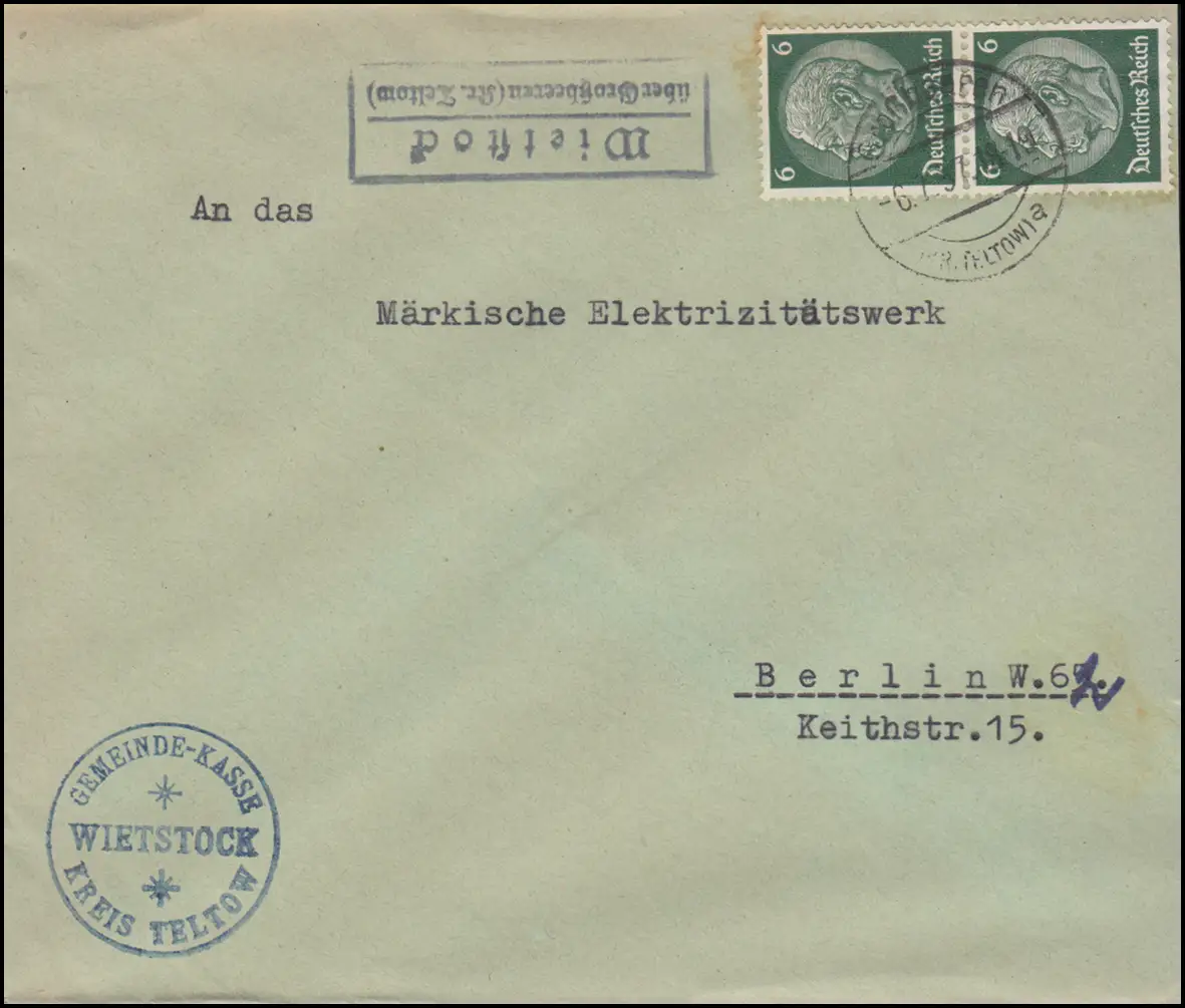 Landpost Wietstock über Großbeeren (Kr. Teltow) 6.7.37 auf Brief