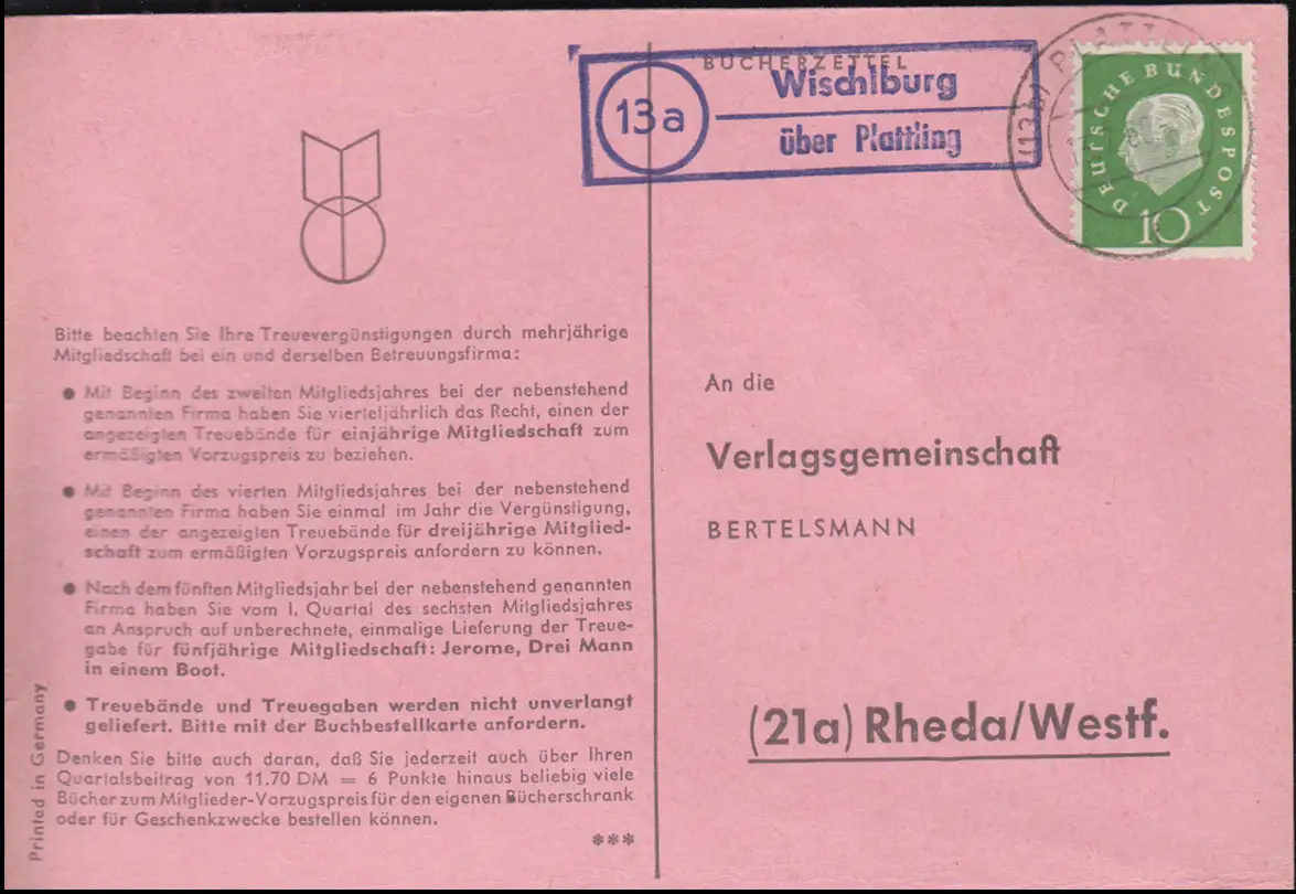 Landpost Wischlburg über PLATTLING 13.7.1960 auf Bücherzettel nach Rheda/Westf.