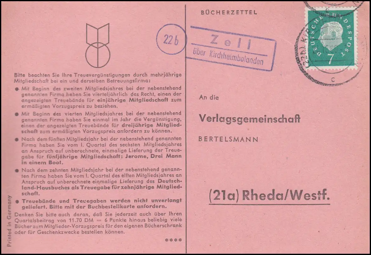 Landpost Zell über KIRCHHEIMBOLANDEN 24.10.1960 auf Postkarte nach Rheda/Westf.