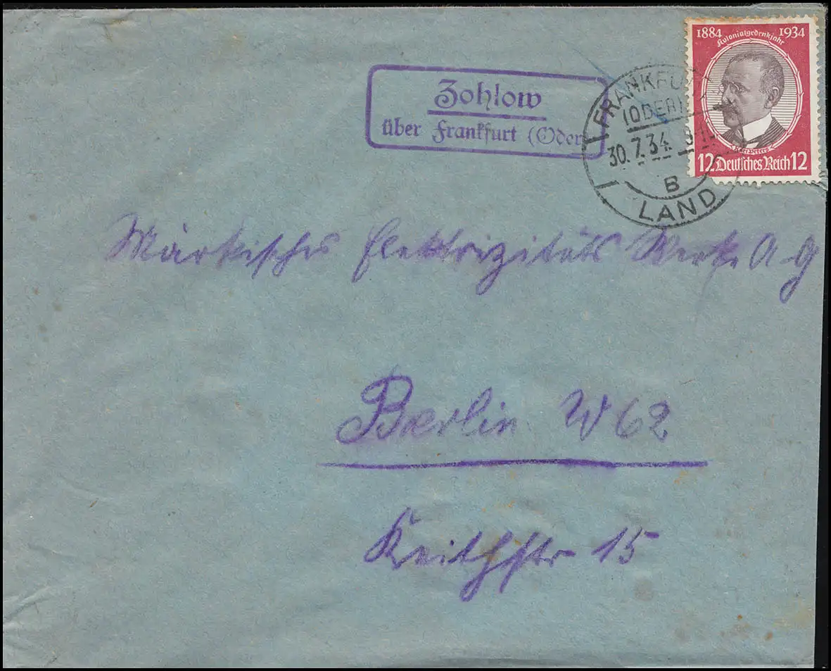 Landpost Zohlow über Frankfurt Oder, Brief FRANKFURT ODER LAND 30.7.34