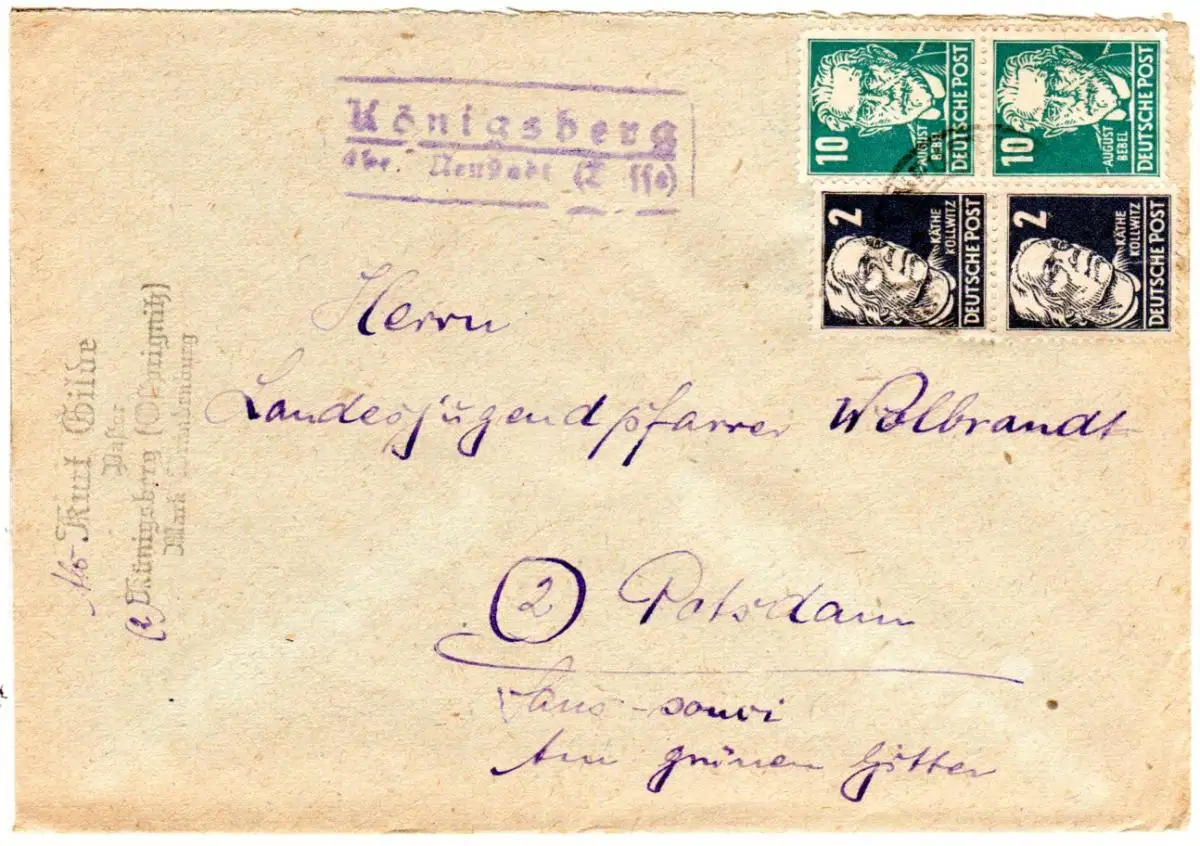 Landpoststempel KÖNIGSBERG über Neustadt (Dosse) auf Brief m. je Paar 2+10 Pf.