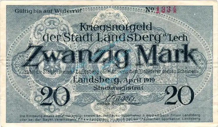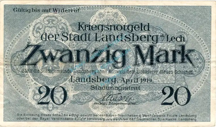 Landsberg , Banknote 20 Mark Schein gbr. Geiger 307.02 , Bayern 1919 Grossnotgeld