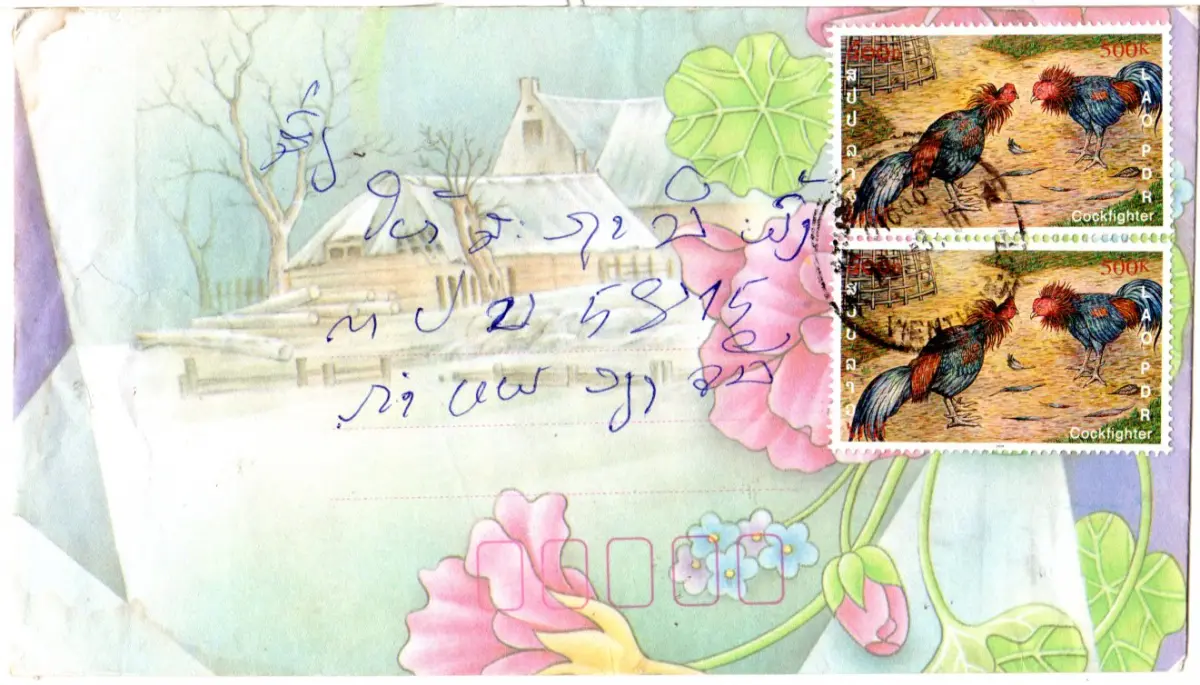 Laos, MeF 2x 500 K. Kampf Hahn auf Luftpost Brief. Thematik Vögel.